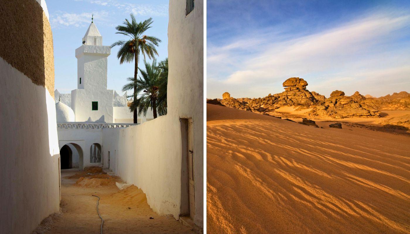 Si eres de los que huyen de las multitudes, no te pierdas el Sáhara libio, mucho menos transitado que los anteriores. Las dunas parecen ser una constante en un país en el que, nuevamente, el 90 % de su territorio es desértico. Entre los puntos de interés de una ruta por el Sáhara de Libia está Ghadames y, en especial, su parte vieja, declarada Patrimonio de la Humanidad por la Unesco. Sus calles de arena que serpentean entre casas blancas animan a ser recorridas y a perderse por ellas.